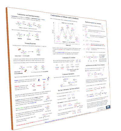 Conformations, conformers, and conformational isomers, Newman projections, Staggered and Eclipsed conformations, Torsional and Steric strain, Conformations of Cycloalkanes, the Chair conformation, Ring-Flip, Calculating the energy of a Chair conformation.