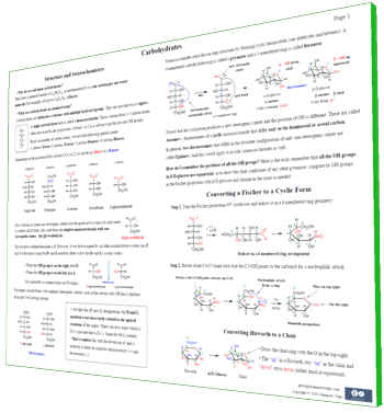 A comprehensive, easy-to-follow two-page summary of the Structure, Stereochemistry, and Key Reactions of carbohydrates. Aldoses, ketoses, treoses, tetroses and etc. Everything about the D and L notation of sugars and its relationship to the R and S system and optical rotation. Definition of Anomers and Epimers, α- and β-glucose and their representation in cyclic forms. You won’t look at the carbohydrates the same way again!