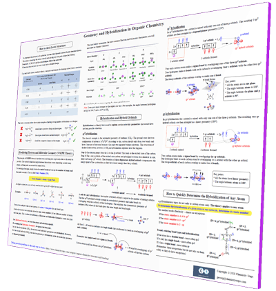 A shortcut to Predicting Electron and Molecular Geometry (VSEPR Theory) accompanied with a chart for all the possibilities geometries in Organic Chemistry. Hybridization and Hybrid Orbitals: understand the bond types and angles as well as a shortcut to quickly determine the sp3, sp2, and sp hybridization.
