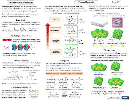This two-page guide will be a handy summary of the intermolecular interactions such as ionic bonds, hydrogen bonds, dipole-dipole interactions, London dispersion forces, their relative strength, and their relation to the boiling and melting points. The specific examples on page two will give you a pattern for determining the compound with a higher boiling or melting point.