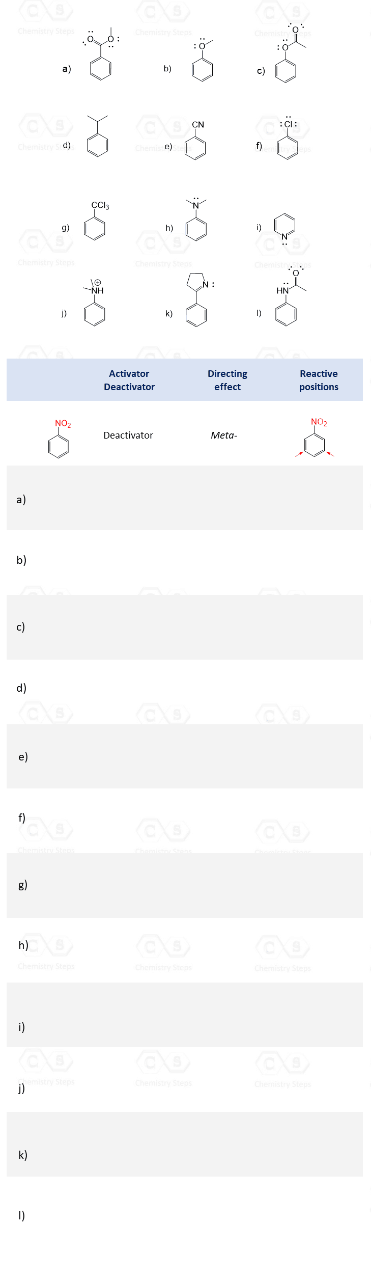 In the following practice problems, we will go over the ortho-, para-, and meta – directors in Electrophilic Aromatic Substitution. The first exercise is to make sure you know which groups are activators and deactivators, as well as how that relates to the Ortho-, Para-, and Meta – directing effects.