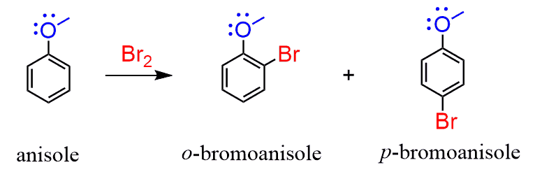 Let’s now look at an example where the aromatic ring is activated by the resonance effect. For example, anisole is an activated aromatic ring and does not even require a catalyst to be halogenated because the resonance effect is very strong. In addition, halogenations are the fastest among all the electrophilic aromatic substitution reactions: