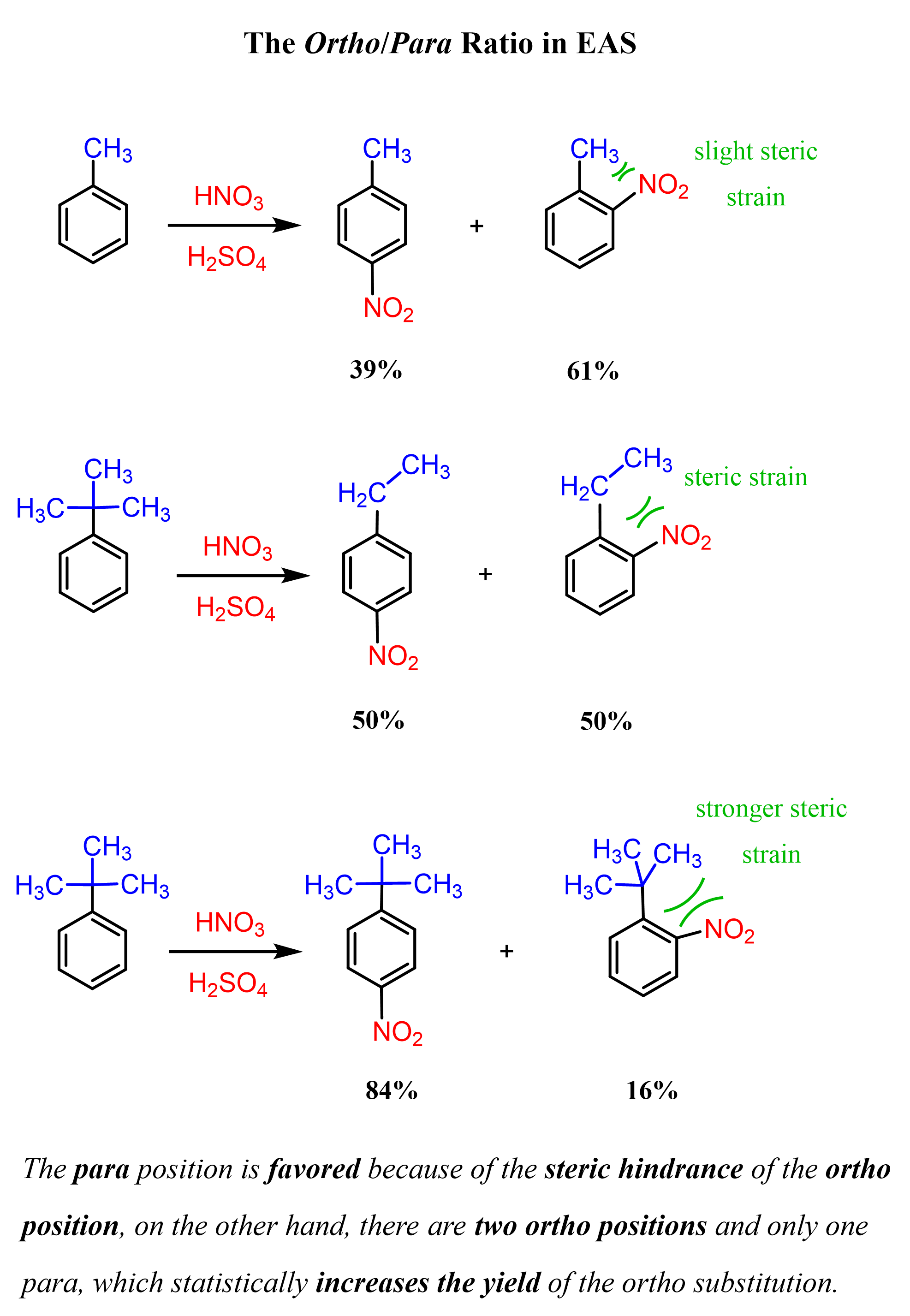 The ratio of the ortho and para substitution is difficult to predict. On one hand, the para position is favored because of the steric hindrance of the ortho position; on the other hand, there are two ortho positions and only one para, which statistically increases the yield of the ortho substitution. The larger the group present on the ring, the more favored the para substitution would be. For example, the nitration of toluene (methyl benzene) produces a mixture of ortho and para isomers in approximately 60 : 40 ratio. Having a larger alkyl group increases the ratio in favor of the para isomer because of greater steric hindrance: