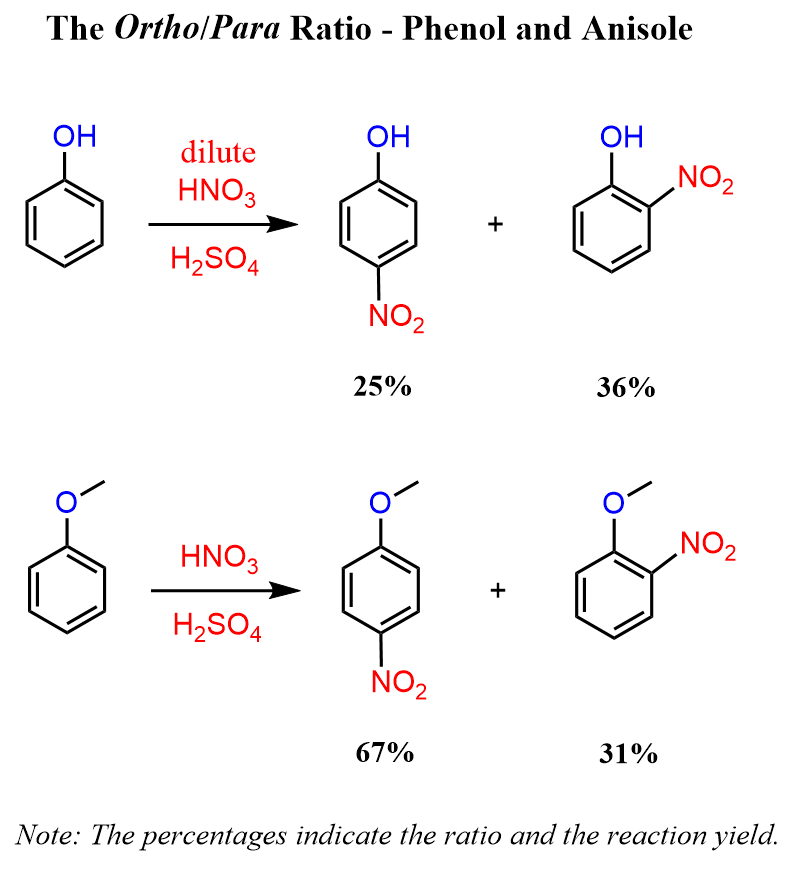 A similar pattern can be seen when comparing the ortho/para ratio for the nitration of phenol and anisole. In this case, though, the intermolecular interaction, such as hydrogen bonding between the OH and NO2 groups, also contributes to the formation of the ortho isomer: