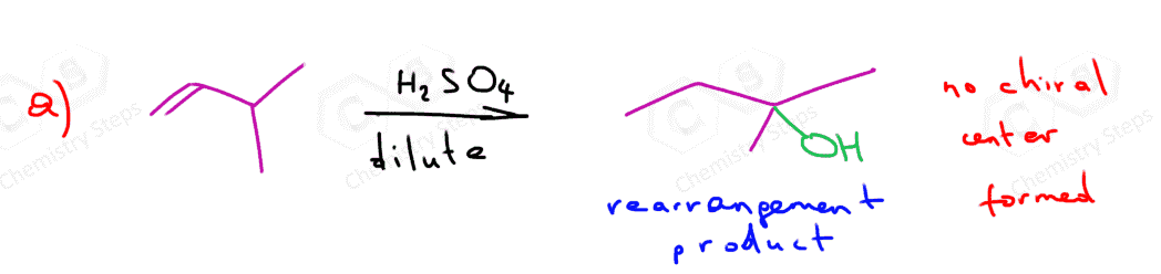 In the first sentence of this article, we mentioned that acid-catalyzed hydration generally follows Markovnikov’s rule. The reason for this is the possibility of carbocation rearrangements in electrophilic addition reactions of alkenes when they occur via an ionic mechanism. In the example above, when 1-butene is reacted with water, there is no possibility of converting the secondary carbocation to a tertiary carbocation; thus, no rearrangement can occur.