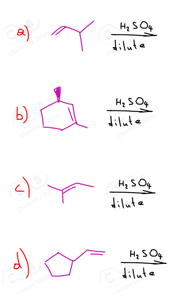 Let’s quickly recall the mechanism. The reaction starts with protonation of the double bond, forming the more substituted/stable carbocation. The consequent nucleophilic attack by water on this carbocation, followed by deprotonation, produces the more substituted alcohol as the major product.