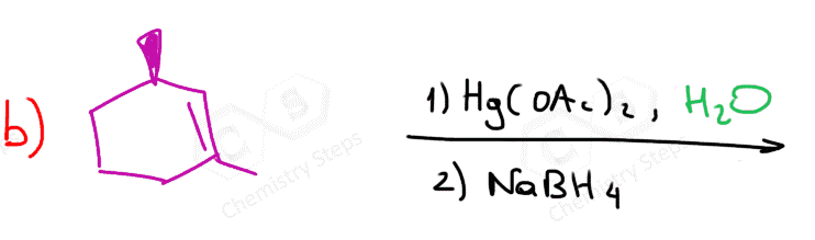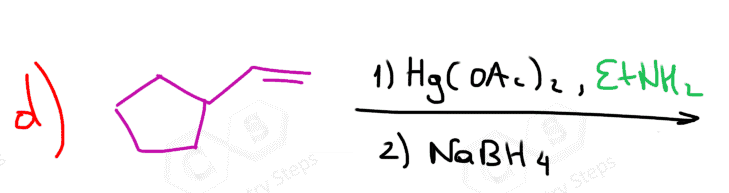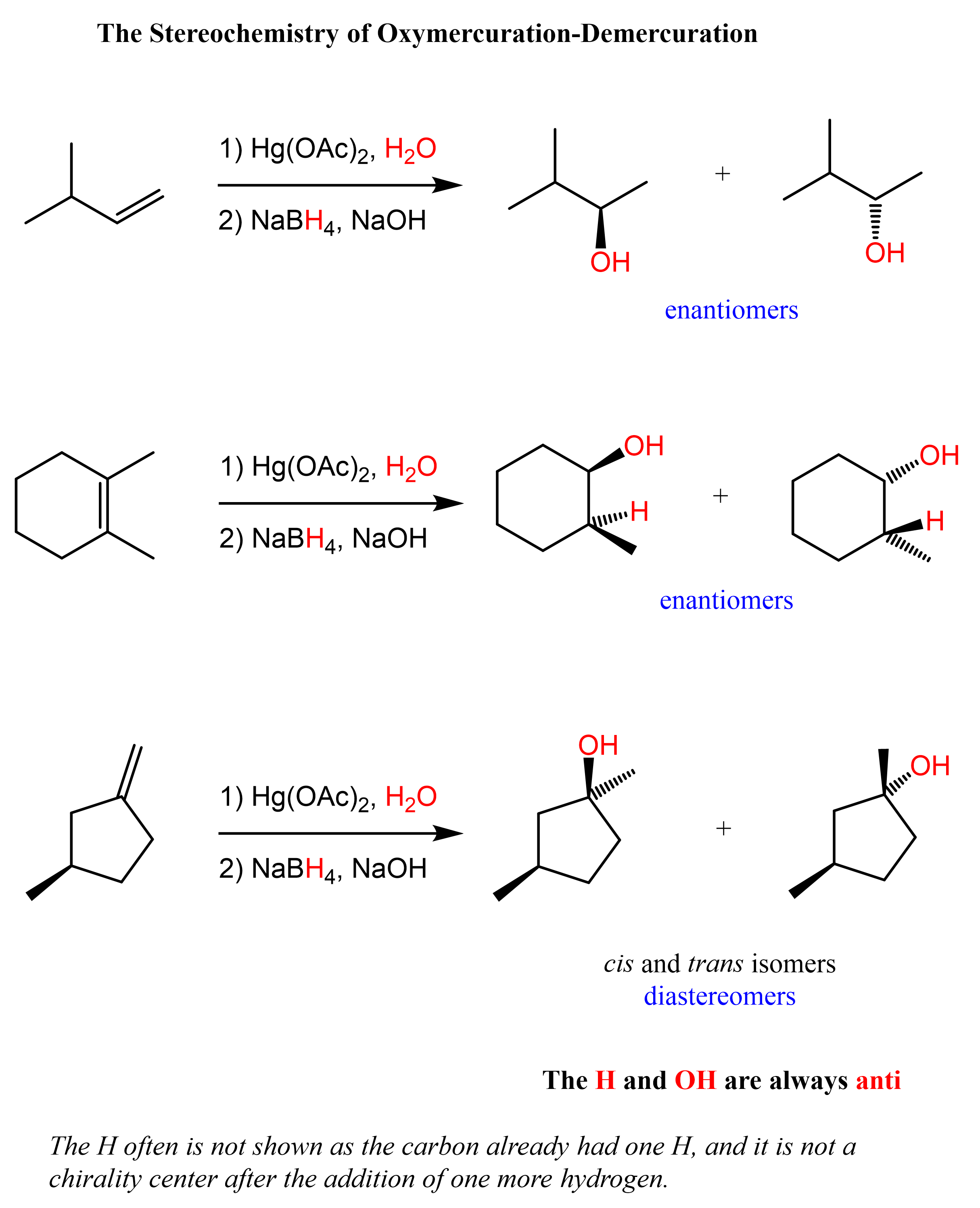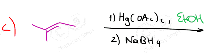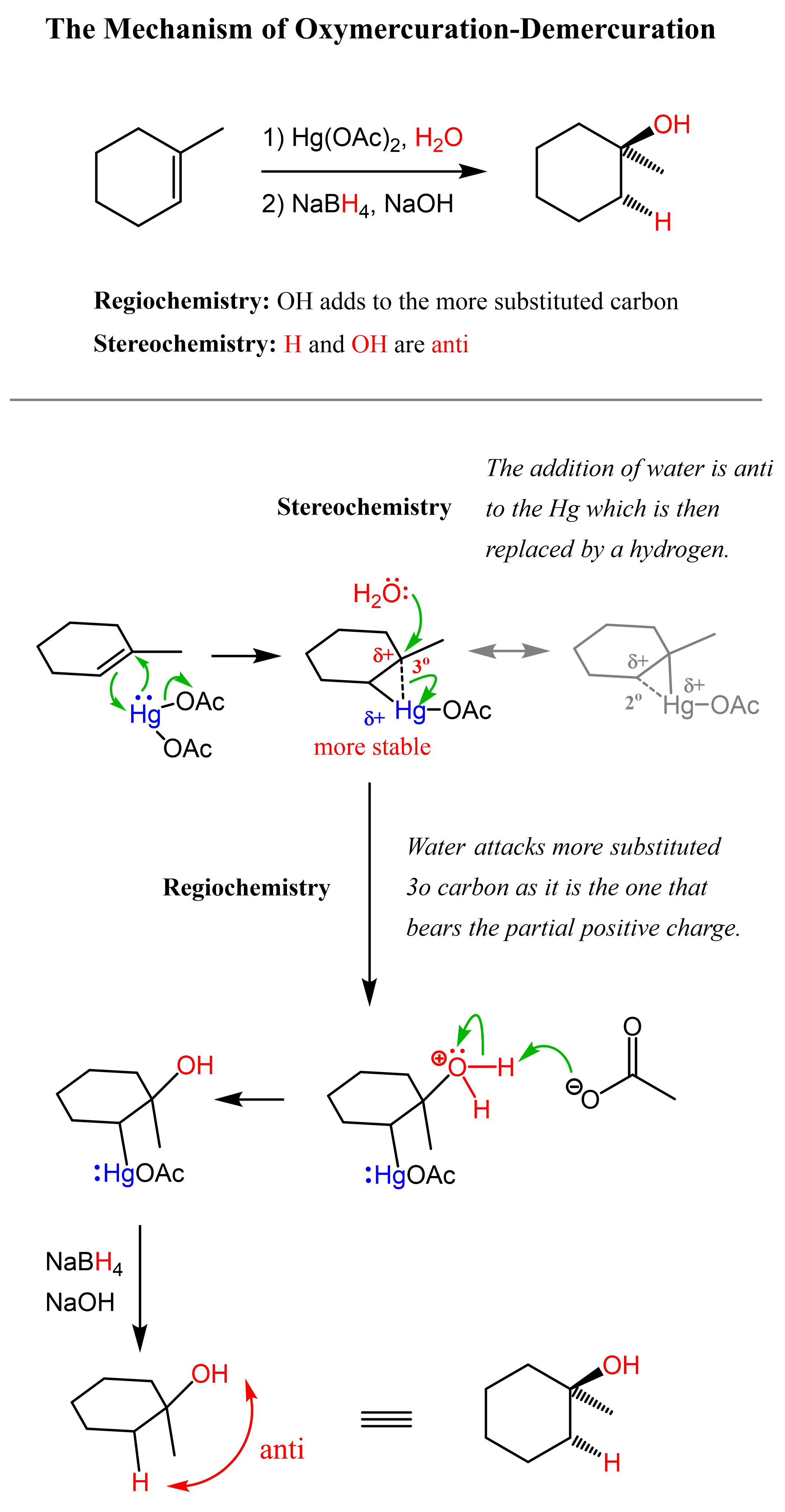 In the last part, the mercury is then removed using sodium borohydride (NaBH4), which reduces the acetoxymercury group and replaces it with its own hydrogen. This is described as demercuration, and it is believed to follow a radical mechanism that is not covered in undergraduate courses.