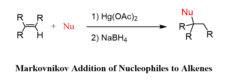 The mercurinium ion can be used as an electrophile not only for water but for many other nucleophilic reactants such as alcohols, thiols, and amines. So, we can put together the following equation as a general guide for the Oxymercuration-Demercuration:
