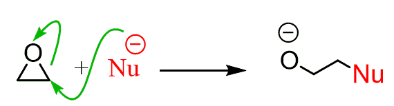 For example, epoxides are three-membered rings containing an oxygen, and when reacted with strong or weak nucleophiles, they readily undergo a ring-opening reaction:
