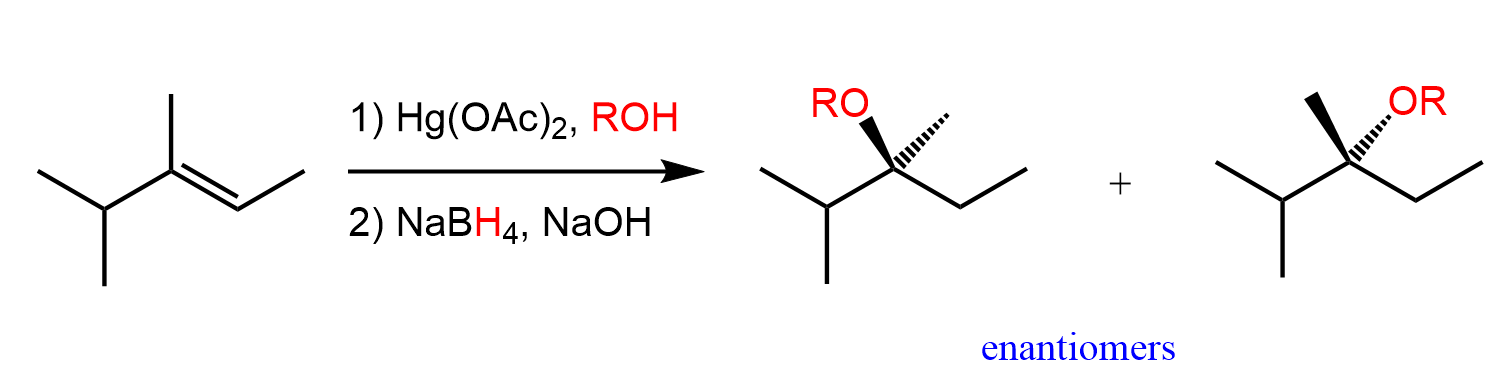For example, the addition of alcohols to alkenes in the presence of Hg(OAc)2 is called alkoxymercuration, and it produces an ether following the same regio- and stereoselectivity of the reaction: