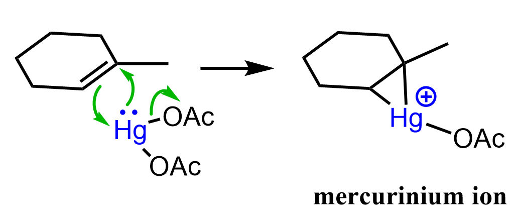 In the first step, a positively charged cyclic intermediate called mercurinium ion is formed via the addition of mercury acetate to the double bond.