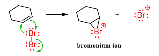 The pattern of reactivity in 3-membered cyclic structures can also be seen in the reaction of alkenes with halogens, where a reactive intermediate called halonium ion is formed, which is then attacked by either the halide ion or water: