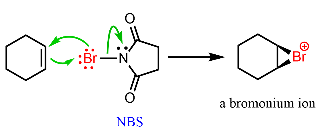 Although today’s focus is specifically on the reaction of alkenes with bromine, it is worth mentioning that halonium ions can also be prepared by using N-bromosuccinimide (NBS) instead of molecular bromine:
