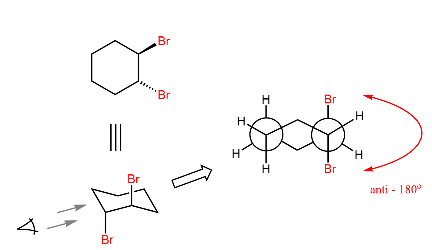 Notice that the bromine in the bromonium ion is the leaving group, and the bromide ion is the nucleophile, and overall, we have an SN2 substitution where the two species are at 180o. As a result, the two bromines have an anti orientation in the ring. Recall from Newman projections that anti conformation is when two groups of interest are anti-periplanar, i.e., the dihedral angle between them is 180o: