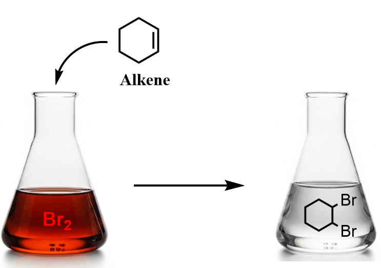 What’s particularly interesting about the reaction of alkenes with bromine is that it serves as a simple and effective test for the presence of a double bond. The reddish-brown color of bromine disappears as a colorless dibromo compound is formed: