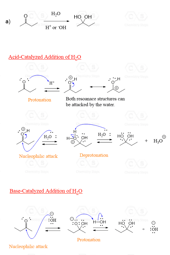 To summarize the mechanisms, the order of nucleophilic attack and protonation is reversed in acid and base-catalyzed hydration of aldehydes and ketones. Also, the water and hydroxide ion serve as a nucleophile in each reaction, respectively.