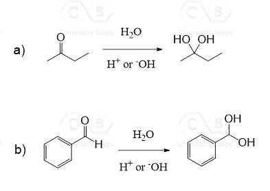 Aldehydes and ketones react with water in the presence of an acid or a base, forming a Hydrate – Geminal Diol: