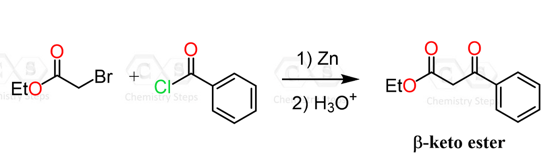 - The use of zinc also suppresses self-condensation, since the organozinc species does not react with esters in the same way as strongly basic enolates do.