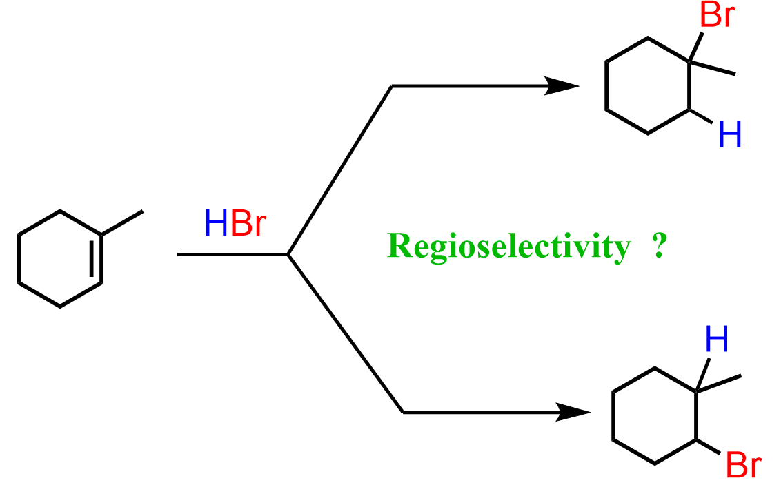 The regiochemistry of regioselectivity of a reaction is the preferential formation of one out of two or more possible regioisomers. For example, when an unsymmetrical akene is reacted with a hydrohalic acid such as HBr, HCl, and HI, the halogen can theoretically end up either on the more substituted carbon or the less substituted carbon of the double bond: