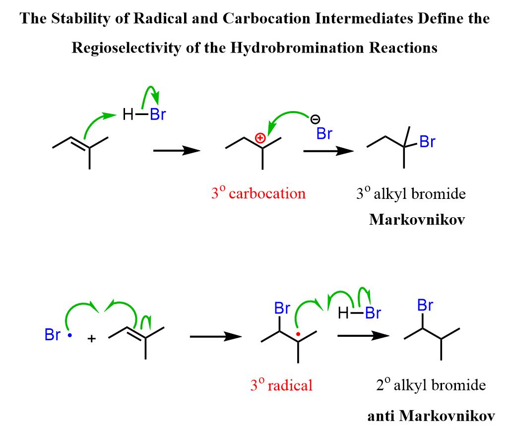 If in a given reaction, one of the pathways is predominant, then we say that the reaction is regioselective. In hydrohalogenation reactions, the halogen most often adds to the more substituted carbon of the double bond (Markovnikov’s rule) unless HBr is used in the presence of a peroxide which changes the reaction to a radical mechanism and the Br adds to the less substituted carbon: