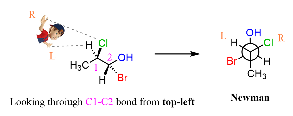 Now, when asked to draw the Newman projection, a direction must be given. Here you can see that Cl is on the top right (facing the right hand), H is on the top-left (left hand) and methyl is pointing straight down. And that is all there is to the first carbon: