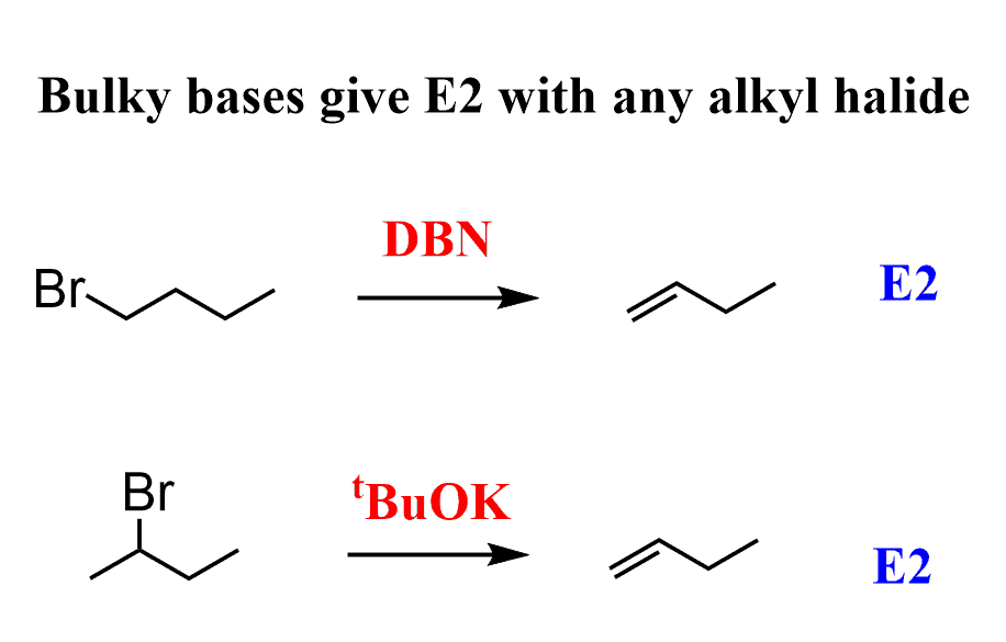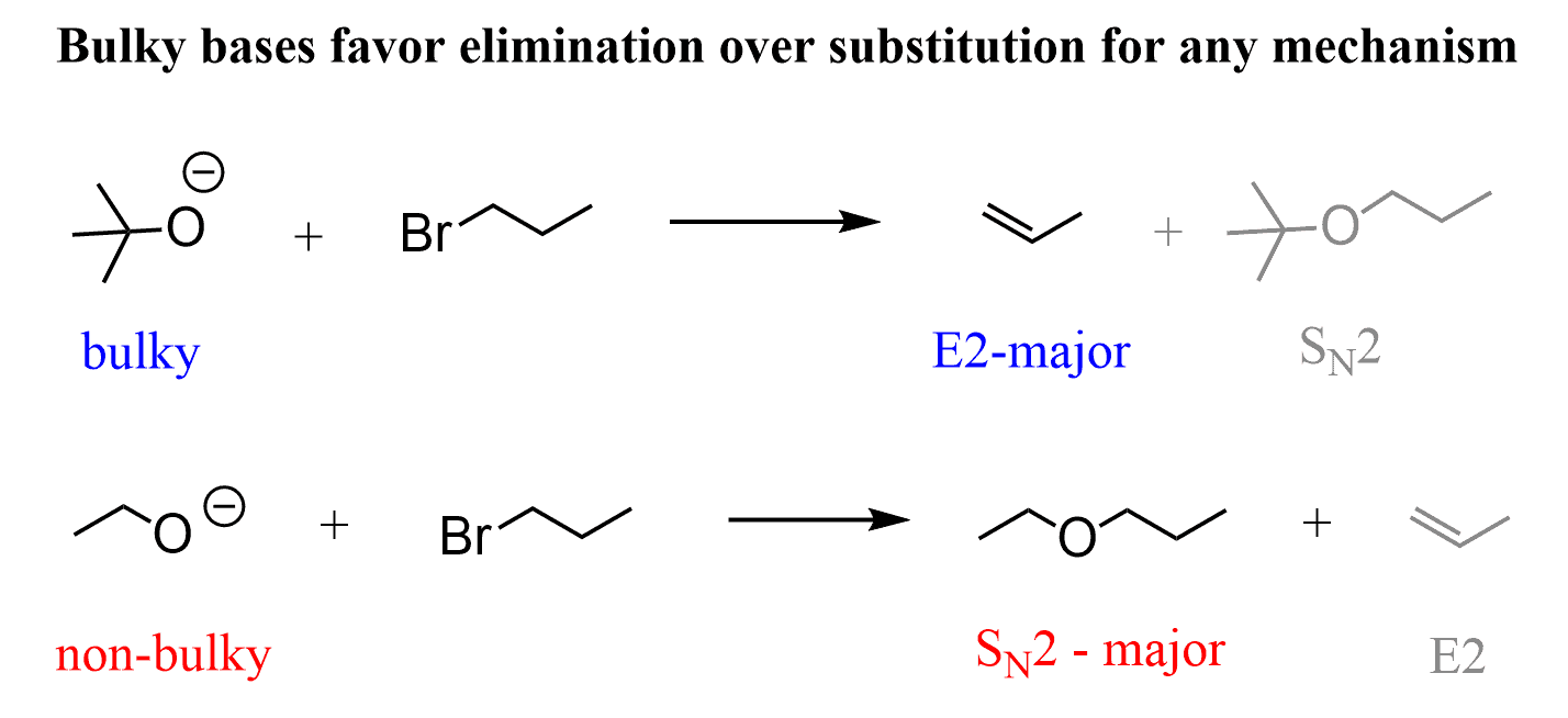 2) If it is a strong, bulky base – E2 only. If it is a non-bulky base, look further into the substrate – primary substrates do SN2, secondary and tertiary do E2 as the major mechanism.