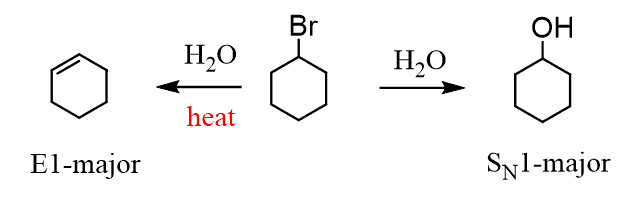 The weak reactants are mainly going to be the water and alcohols. And choosing between E1 and SN1 is easy – the main factor is the heat. If heat is mentioned, then it is a hint to you that E1 elimination is the main mechanism in that reaction: