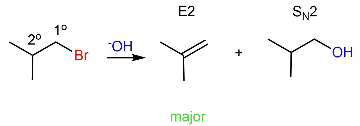 And if a nucleophile that is also a strong base (for example HO-, and especially anything bulkier) is used with a substrate containing alkyl groups and a hydrogen in the beta position, for example, isobutyl bromide, the E2 path will likely predominate because of the steric hindrance.