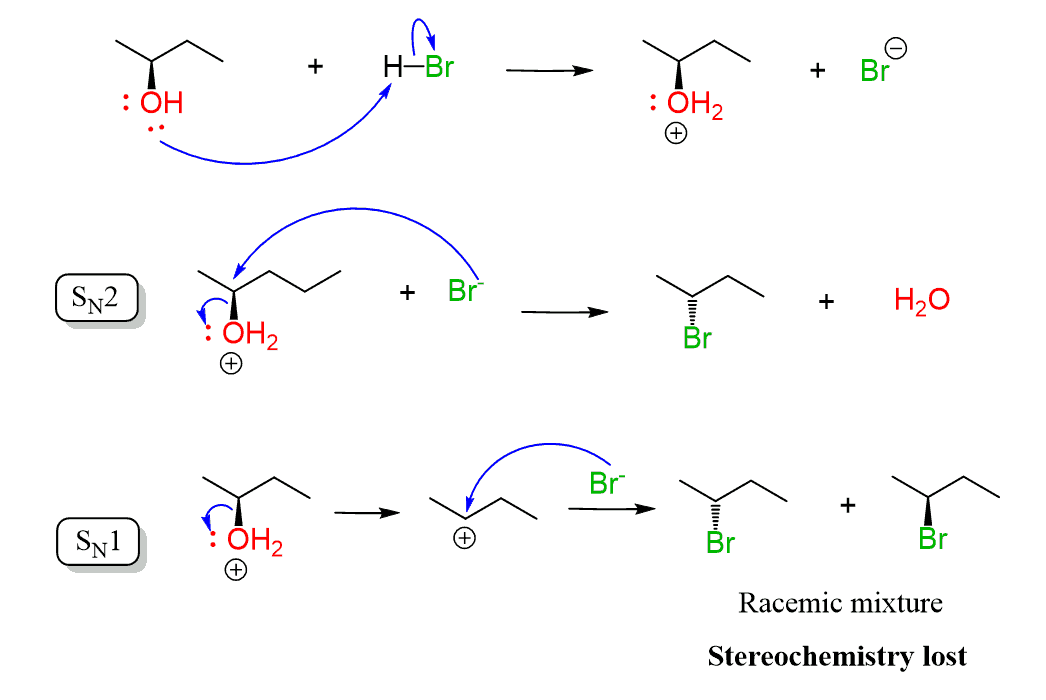 Now, while primary and tertiary alcohols are not at risk of losing stereochemistry since the carbon is not chiral, secondary alcohols may go in the SN1 path, thus losing chirality: