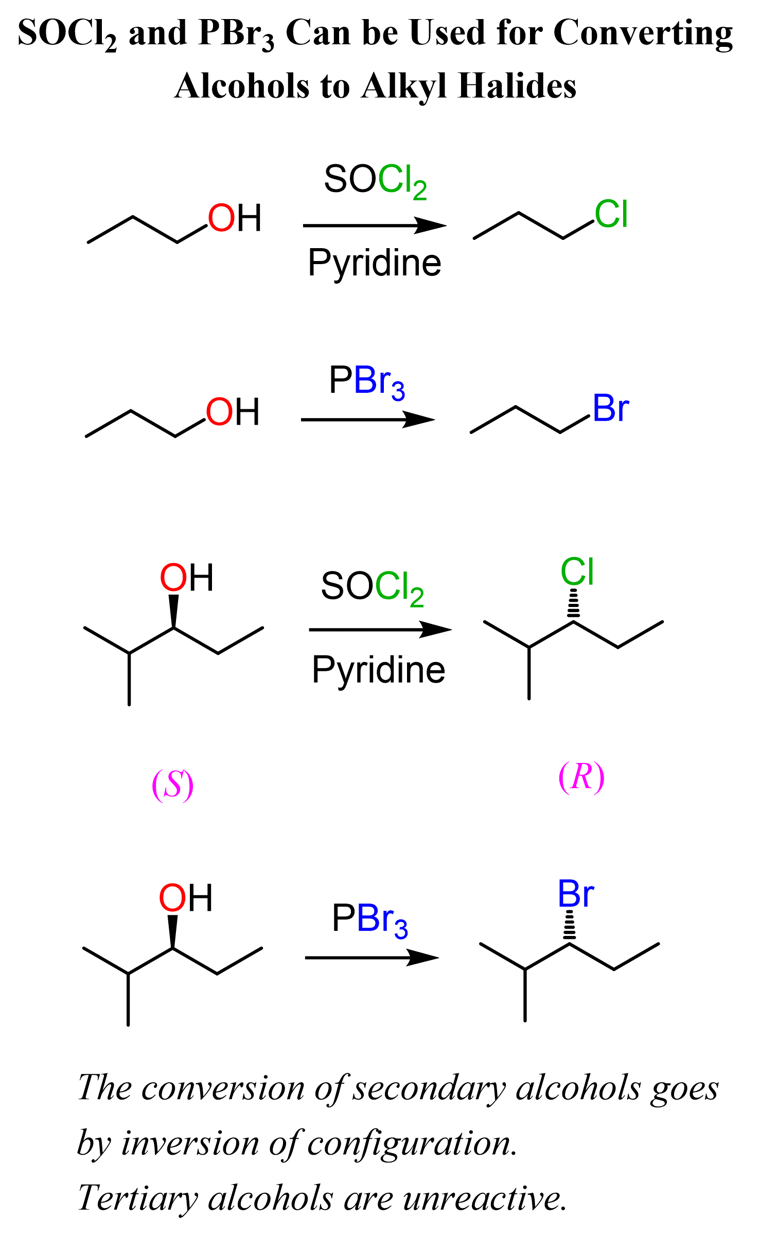 Thionyl chloride (SOCl2) and phosphorus tribromide (PBr3) can be used for converting primary and secondary alcohols to alkyl chlorides and alkyl bromides respectively: