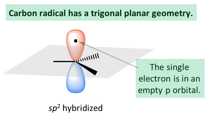 Our focus is going to be on the stability of carbon radicals, so let’s mention that the carbon here is sp2 hybridized with trigonal planar geometry: