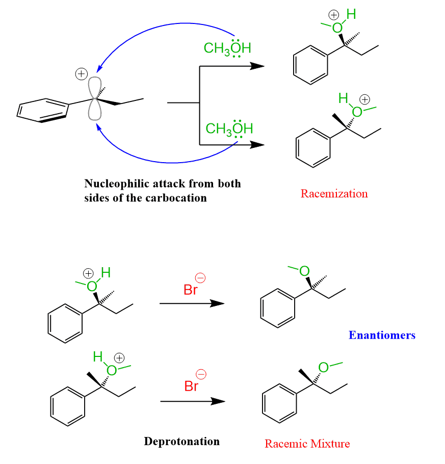 The formation of a racemic mixture is somewhat similar to the SN1 mechanism, where the carbocation is attacked by the nucleophile from both sides leading to racemization of the newly-forming chiral center: