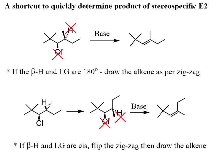 Predicting the product of a stereospecific E2 reaction by drawing Newman projections is great for explaining the concept, yet it is time-consuming. So, let me give you a quick tip.