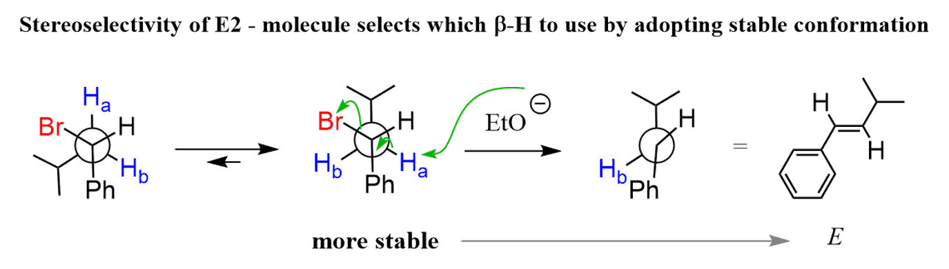 So the elimination can occur from both conformations of the substrate since there are two β hydrogens. This is a stereoselective elimination – the molecule “selects” which β hydrogen to use to produce the most stable alkene (E is more stable than Z).