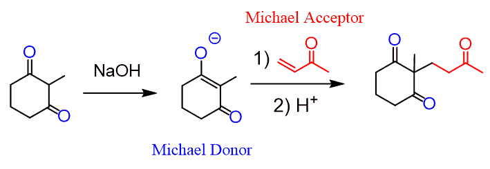 We talked about the Michael reaction in which the nucleophile is a doubly stabilized enolate performing a conjugate (1, 4) addition:
