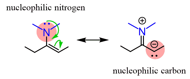 We can see the nucleophilic sites by drawing the resonance structure of an enamine:
