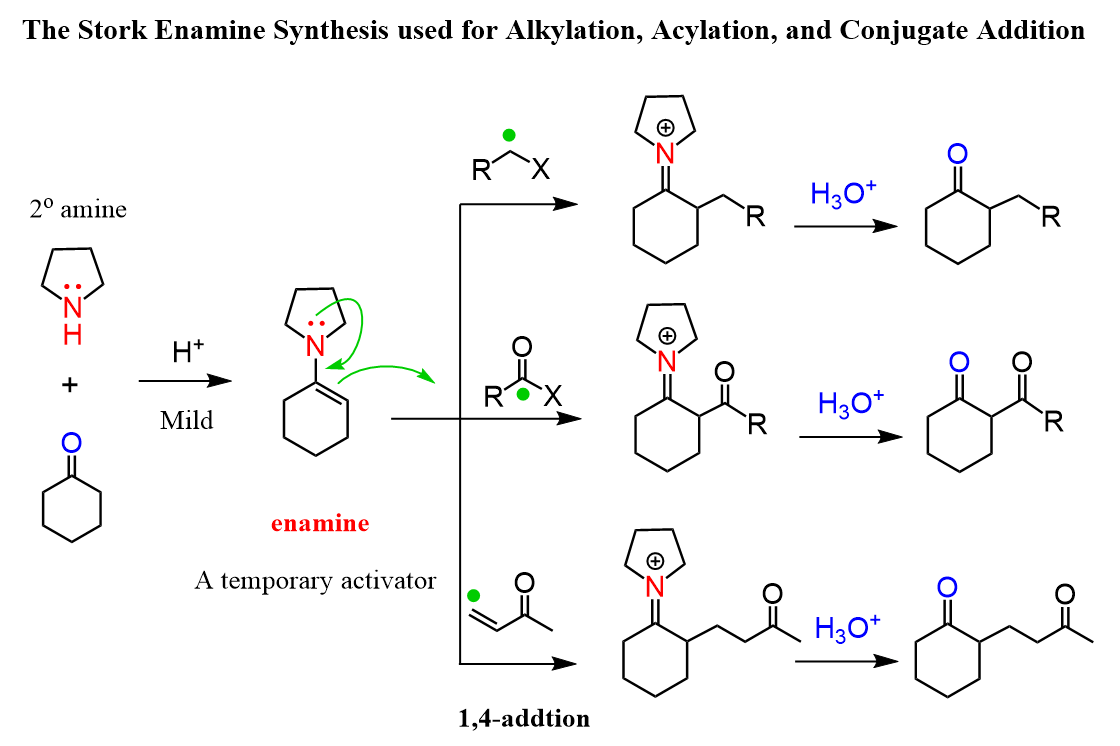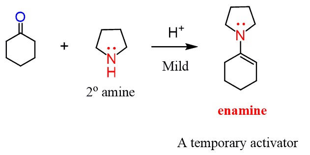 So, overall, the enamine serves as a temporary activator by turning the carbonyl into a nucleophile.