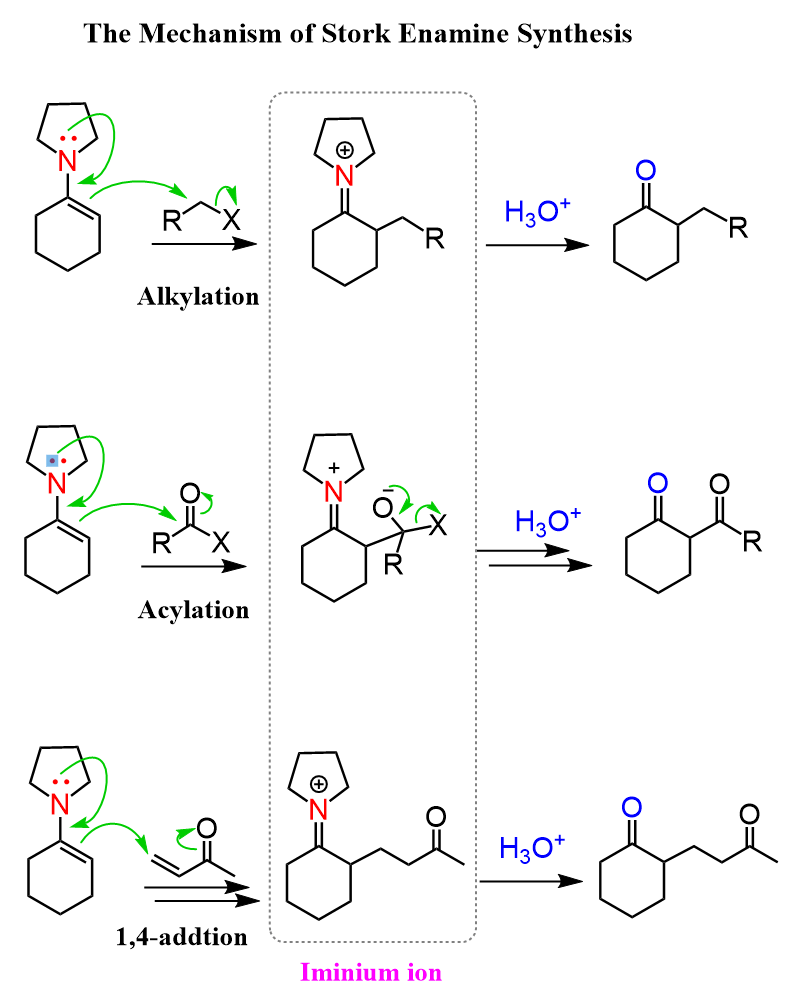In the second part, we have the nucleophilic attack of the enamine. For the alkylation, it is a simple SN2 mechanism, the acylation is an addition-elimination mechanism, and the conjugate addition is what we saw in the Michael reaction: