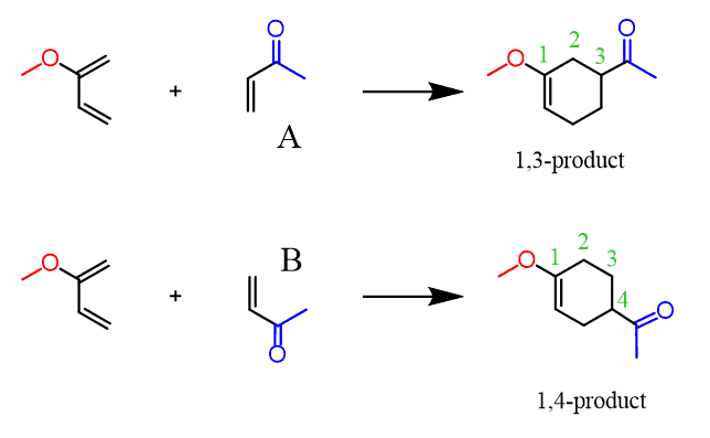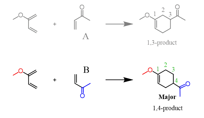 Let’s also look at an example where the electron-donating group of the diene is on carbon number 1 (1-substituted diene):