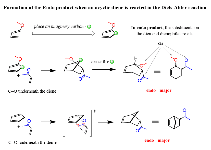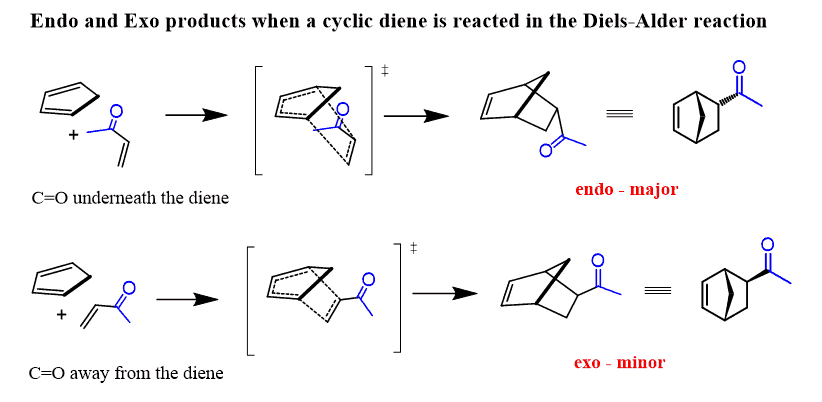 Remember, the endo product is formed when the electron-withdrawing group of the dienophile is pointing towards the π electrons of the diene. This decreases the energy of the transition state because of a favorable interaction between the non-bonding orbitals of the diene and the electrons of the dienophile.