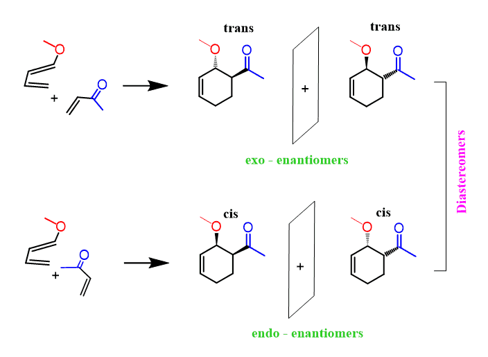 Each endo and exo products are formed in the form of two enantiomers and each endo-exo product is a pair of diastereomers: