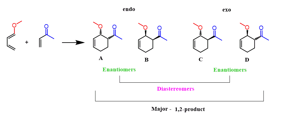 The reaction of a 1-substituted diene forms a product (major regioisomer) with two stereogenic centers and this means that in total, four stereoisomers are possible. These are a mixture of enantiomers and diastereomers and if that concept still gives you a headache, you can check this article one more time.