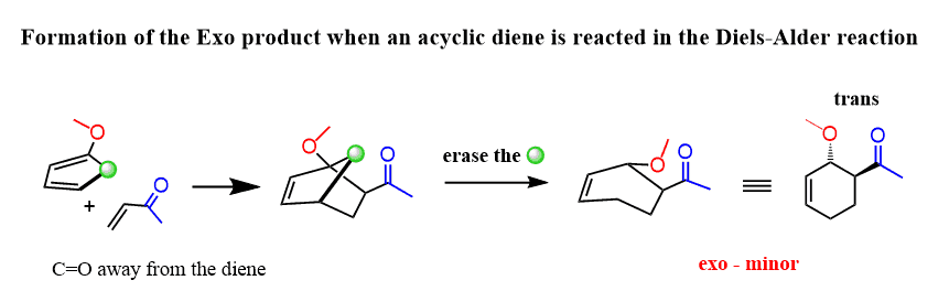The exo product is formed when the electron-withdrawing group of the dienophilie is pointing away from the π electrons of the diene: