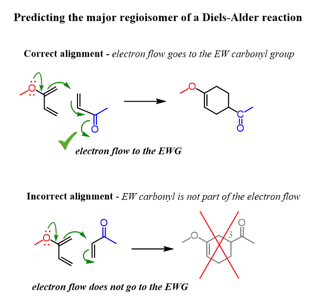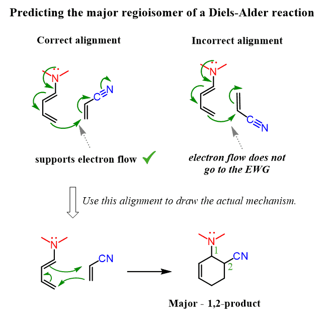 Notice again that this is not the mechanism of the Diels-Alder reaction! It is only to quickly predict the major regioisomer of the product. Once you have determined the correct alignment, you can now draw the actual mechanism.