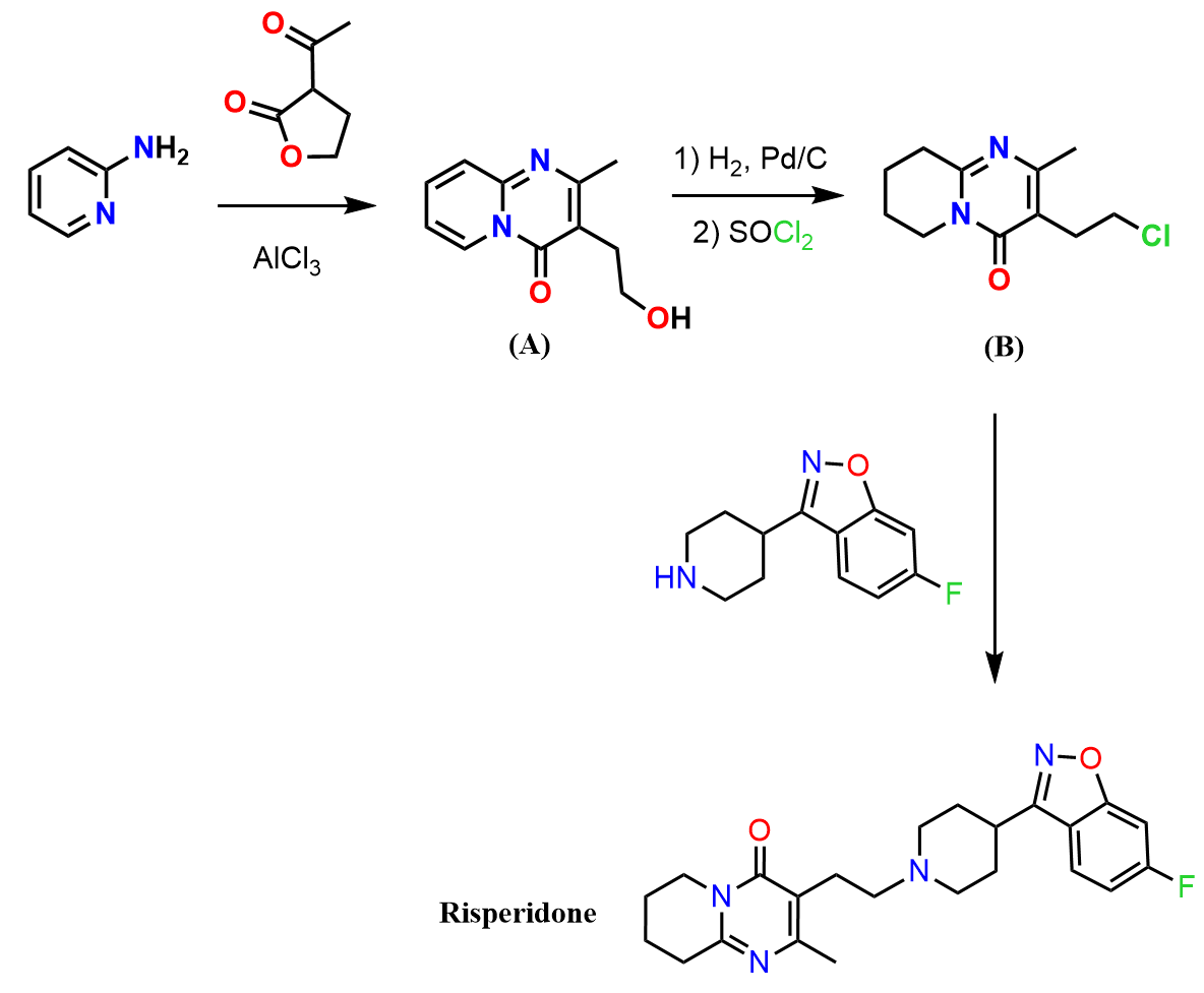 Risperidone is an atypical antipsychotic medication widely used in the treatment of schizophrenia, bipolar disorder, and irritability associated with autism spectrum disorder. It belongs to a class of drugs known as second-generation antipsychotics, which act primarily by modulating dopamine (D₂) and serotonin (5-HT₂A) receptors in the brain. Structurally, risperidone is a complex molecule containing several important heterocyclic and aromatic fragments, including a benzisoxazole ring, a fluorinated aromatic ring, and a piperidine-containing side chain. Because of this structural complexity, risperidone provides an interesting example of how common organic reactions and functional group transformations can be combined in a multistep synthesis to construct a pharmaceutically relevant molecule.