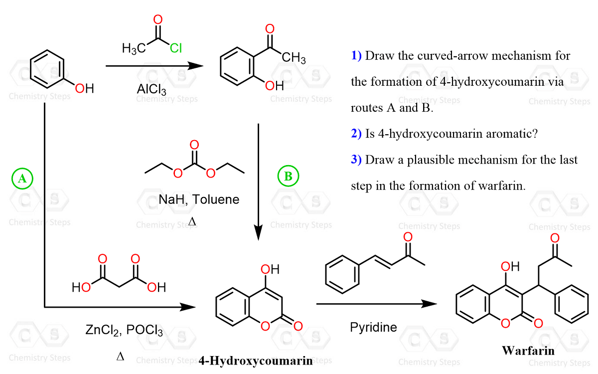 In the following practice problem, we will focus on the organic synthesis of warfarin rather than its pharmacological properties. Specifically, we will examine how the key intermediate, 4-hydroxycoumarin, can be prepared and then transformed into warfarin through a C–C bond-forming reaction (typically a Michael-type addition) with an α,β-unsaturated ketone. The goal is to practice multistep synthesis design, including electrophilic aromatic substitution, condensation reactions, cyclization, and enolate chemistry, while understanding how these transformations build up the coumarin framework and ultimately lead to the final drug molecule.