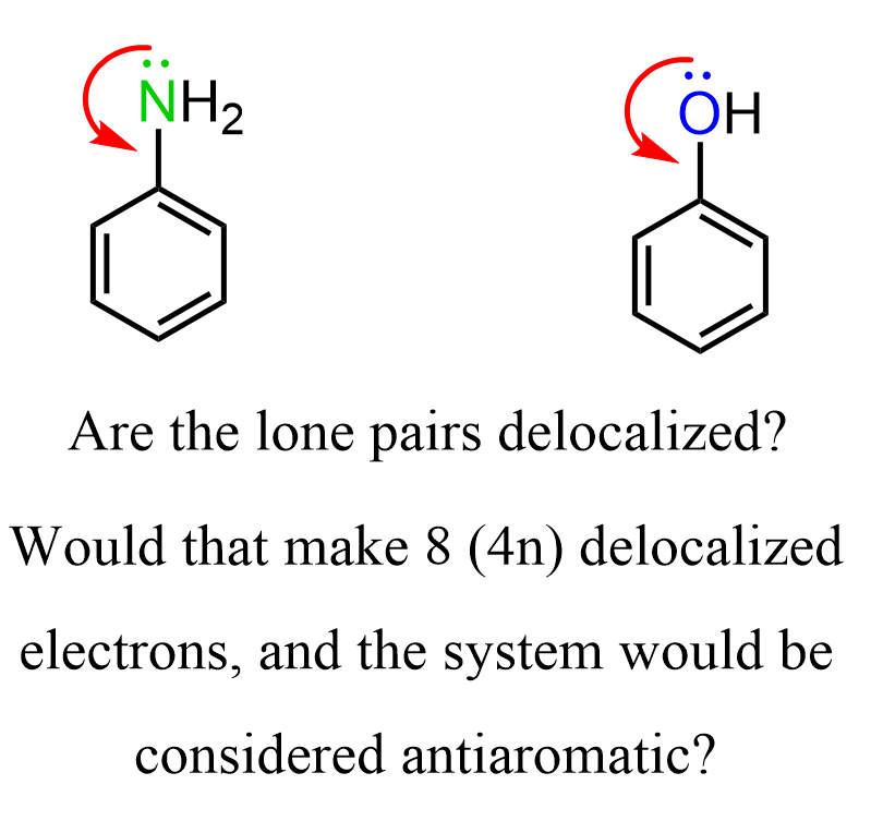 In pyrrole we said that the nitrogen adopts an sp2 hybridization and the lone pair is in the p orbital making it delocalized over the p orbitals of the ring. So, one may wonder why the nitrogen in aniline does not adopt sp2 hybridization making the lone pair delocalized over the ring, thus making the molecule antiaromatic (8 electrons = 4n):