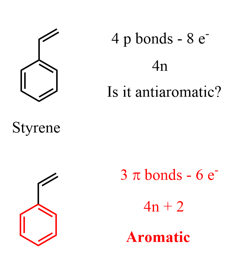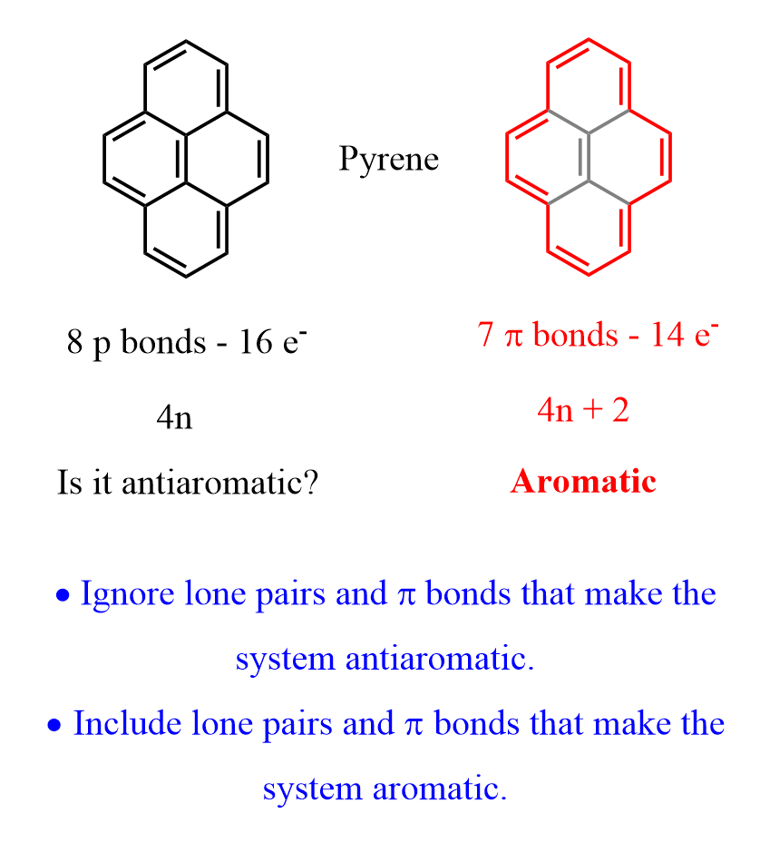 This is true for more complex cyclic compounds – just because you can count 4n number of electrons and classify the molecule as antiaromatic, it does not mean it is. Keep in mind that aromatic compounds are lower in energy whereas antiaromatic compounds are higher in energy – less stable. Therefore, when possible the molecule will be aromatic, or at least a part of it would be.