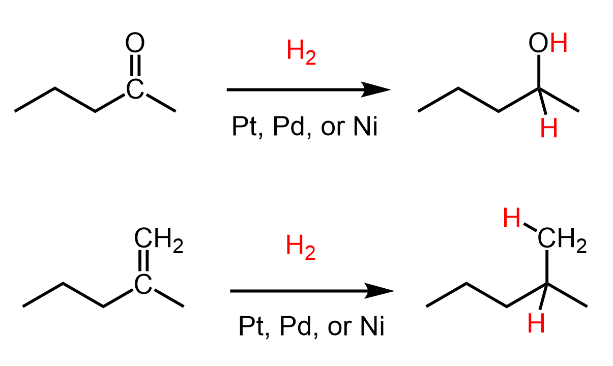 Now, the carbonyl group contains a π bond, therefore, it is a center of unsaturated carbon atoms, therefore, we can add hydrogens to it converting the π bond into single bonds, much like we have seen in the hydrogenation of alkenes and alkynes: