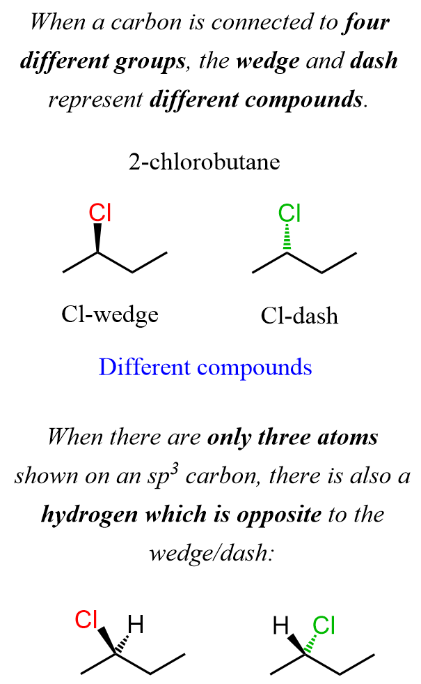 Notice that there are four different atoms connected to the carbon bonded to the chlorine, and this is the reason why having the Cl shown as sedge or a dash makes different compounds. Remember also that there are only three atoms shown on an sp3 carbon, there is also a hydrogen which is opposite to the wedge/dash group.